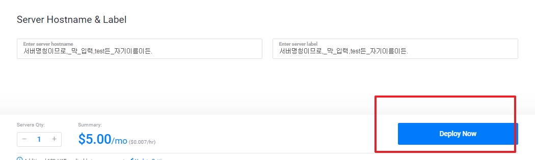 (5) 맨 밑의 Deploy Now를 누르면, 대략 1-2분 정도 서버 만드는 시간이 걸립니다.