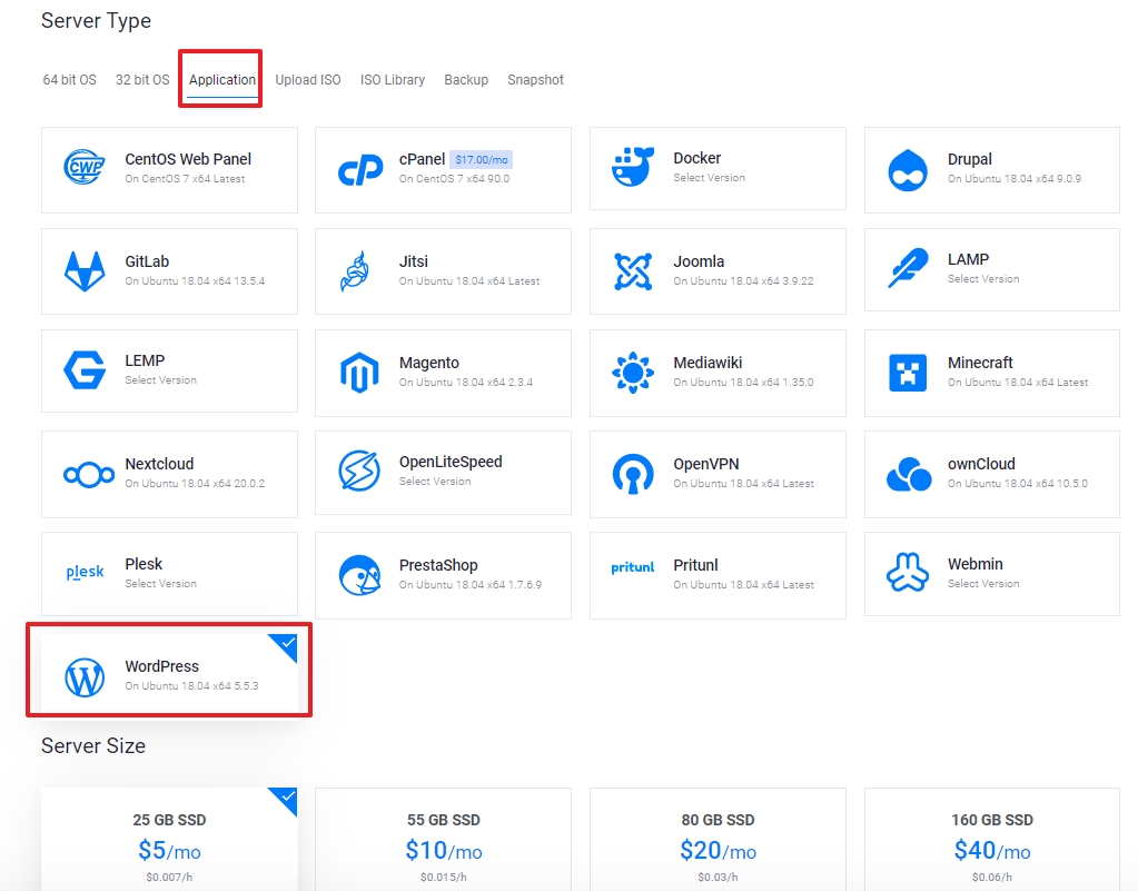 - 하단처럼 Application 선택 - Wordpress를 선택합니다.