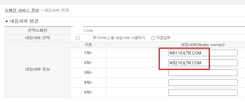 (1) 도메인 구입한 곳에 가셔서, 연결할 도메인의 네임서버 변경을 클릭합니다.