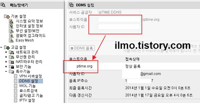 - 공유기의 DDNS 기능을 활성화 ( 빨간 네모칸에 사용할 주소 입력 )