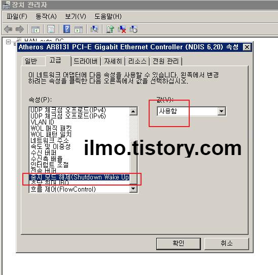 - 하단으로 내리면 '중지모드 해제 (Shutdown Wake Up)의 값을 '사용함'으로 변경