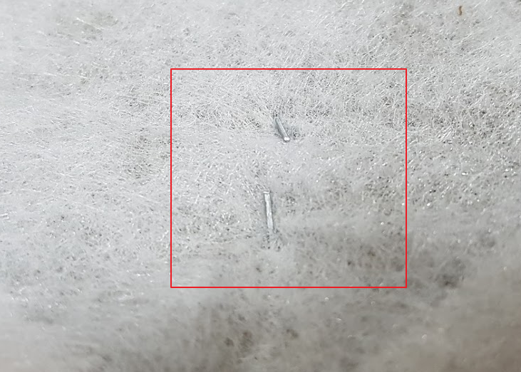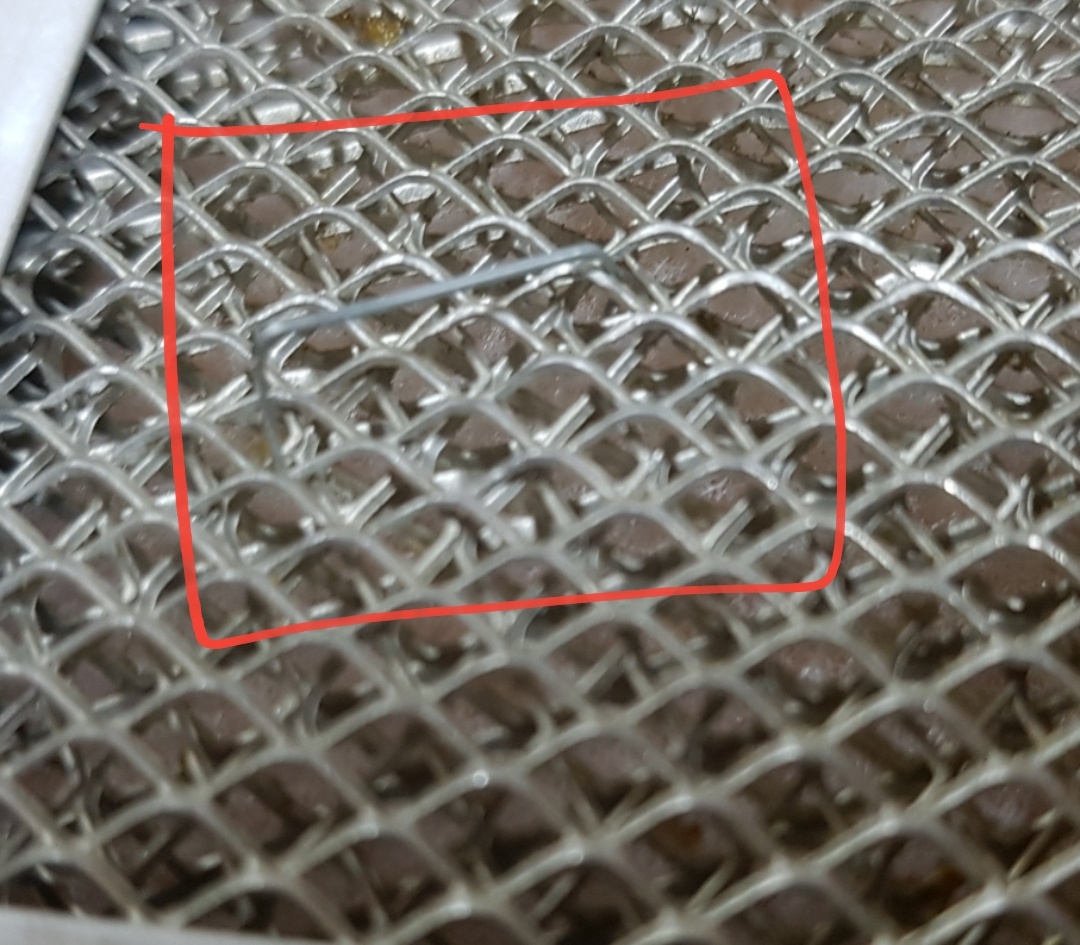 심 한개를 뽑아서, 후드 철망 뒷면에서 삽입 후 - 앞면의 필터 쪽으로 아래 그림처럼 구부려 주면 됩니다.